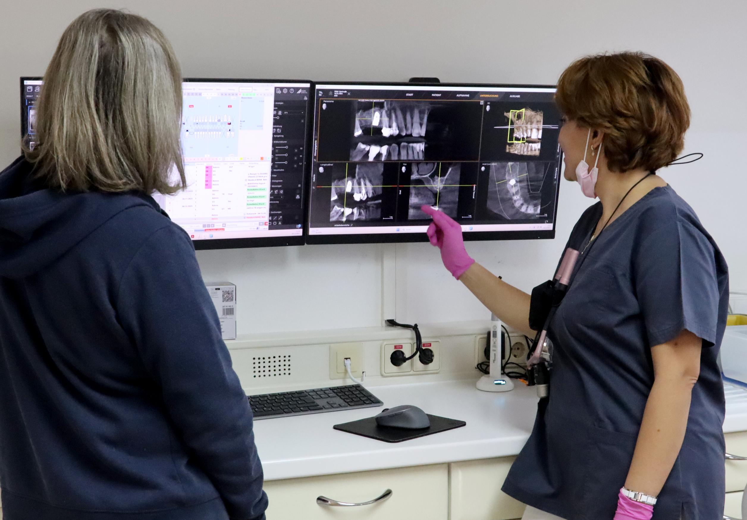 Unsere Praxis verfügt über eine zeitgemäße technische Ausstattung. Dazu gehört ein DVT-Gerät (Digitale Volumentomographie), das dreidimensionale Aufnahmen von Zähnen, Kiefer und angrenzenden Strukturen ermöglicht. Diese Bildgebung unterstützt eine differenzierte Diagnostik und eine strukturierte Behandlungsplanung.